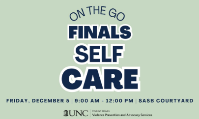 SASB Courtyard 385 Manning Drive Suite 3307Take a quick break, stop by, and build your own self-care goodie bag. We’ll have food, snacks, stickers, fidgets, stress toys, journals, resource information, and more!
